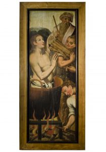 Nesta tábua representa-se um dos martírios a que, segundo a lenda, São João Evangelista terá sido sujeito. O santo aparece em tronco nu, com as mãos postas e os olhos erguidos para o céu. Está dentro de um caldeirão, colocado sobre uma grade que está sobre uma fogueira. À direita, três outras figuras masculinas: em cima, um ancião, por baixo, um homem carrega um molho de lenha e, no canto inferior, um outro atiça o lume.