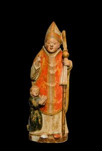 Image of Saint Blaise represented as a bishop, with mitre and crosier. At his feet, there’s a kneeled boy with his hands lifted, an allusion to one of his most popular miracles: he saved a boy by taking a fishbone of his throat. He is, therefore, the saint invoked to cure throat illnesses and, nowadays, he was adopted as the patron saint of laryngologists.