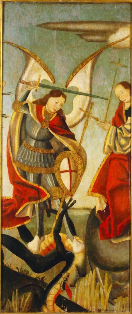 São Miguel, arcanjo, é o chefe do exército celestial e defensor da Igreja e por esta combate e derrota os anjos rebeldes e o dragão, expulsando-os do Céu.