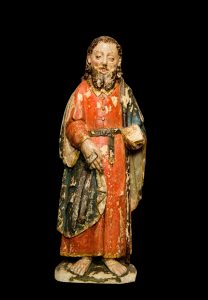 Imagem de São Tomé, descalço, com barba e cabelos compridos, envergando uma veste longa, em tons de vermelho, presa à cintura por um cinto, e sobre a qual cai um manto em tons de verde. Apresenta como atributos uma lança, alusão ao instrumento do seu martírio, e um cinto, alusão à sua incredulidade face à Assunção da Virgem. Na mão esquerda segura um livro.
