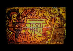 Reproduction of an image depicting the Birth of the Child Jesus, included in the painting that decorates the beams of the ceiling of the Igreja de Nossa Senhora da Oliveira.